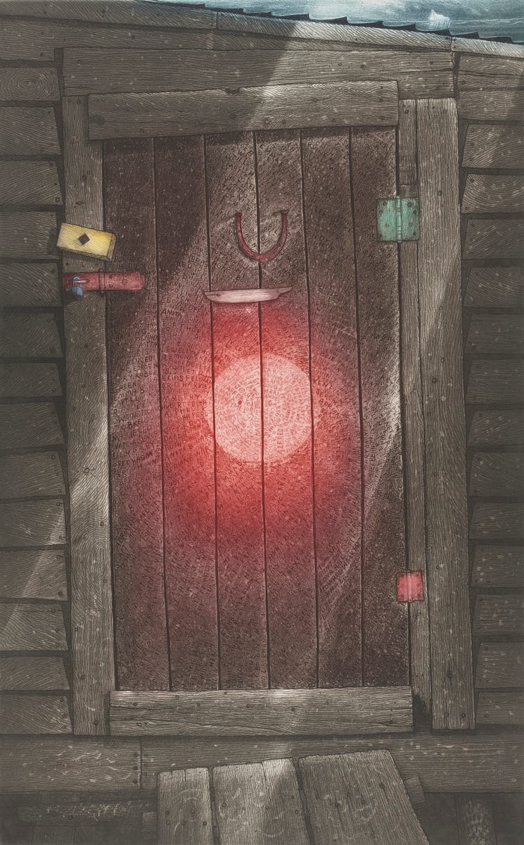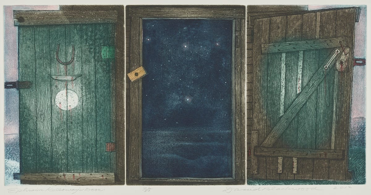 In the 2012 triptych titled simply Ephraim Kelloway’s Door, Blackwood finally does something he’s never done before—he opens the door. At last, we see what the shed looks out on—in the moment, a rare, cloudless Newfoundland night, so dark that the land itself almost slips into the endlessness of the universe beyond. There could be anything out there. And everything.
