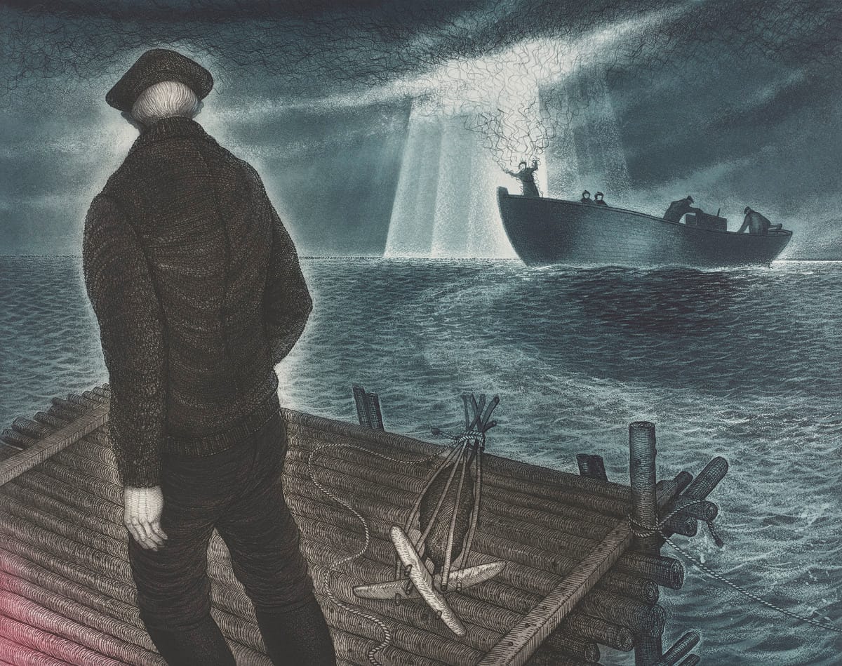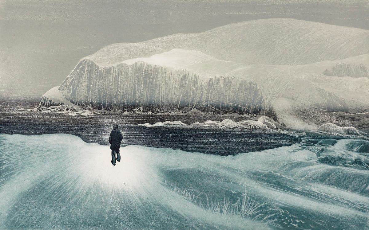 But it’s one of the more subtle and less dramatic prints from Great Sealers that best illustrates what I think is the broader point of Blackwood’s work. In Abandoned Ancestors on Bragg’s Island, an oval-shaped portrait of an elderly couple hangs on a wallpapered wall, in one of the rare flashes of colour, however muted, that Blackwood allowed himself (and certainly one of the rare moments when colour isn’t meant to signify impending destruction). The couple pose a little stiffly but not without affection in their early-century Sunday best, while to the right of the picture there is a window with its glass smashed in, and outside a snowy expanse leading to the water. The wallpaper itself is too intact to suggest this home is too long gone. In the distance, the water appears calm, a collapsing wooden fence at its edge, and it’s only if you squint that you notice, either emerging from the water or contemplating it, a small human silhouette—an intrusion of life in this abandoned void. In the Great Sealers book with Mowat, Abandoned Ancestors forms part of the coda, the first of two double-page spreads that close out the story, bringing the scene into the then-present, when the island’s residents had already been resettled to the mainland. In that inscrutable, distant figure is the refusal to abandon things entirely.