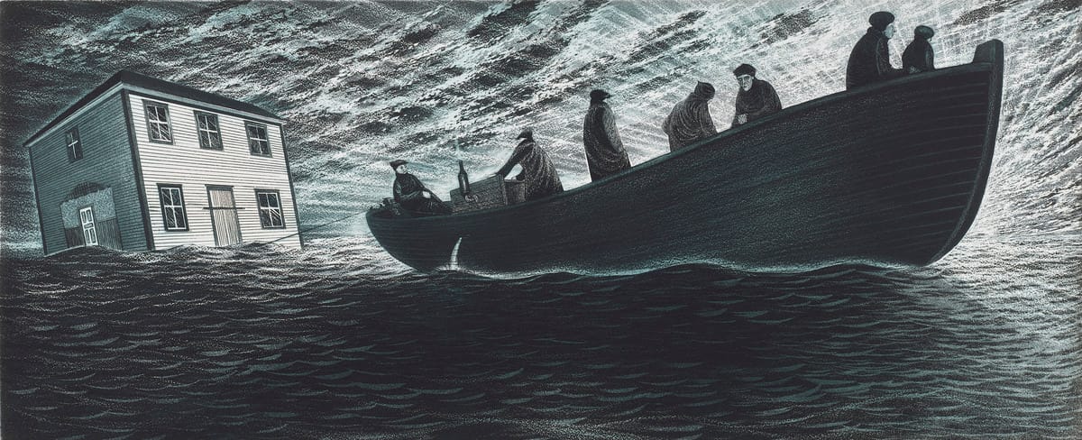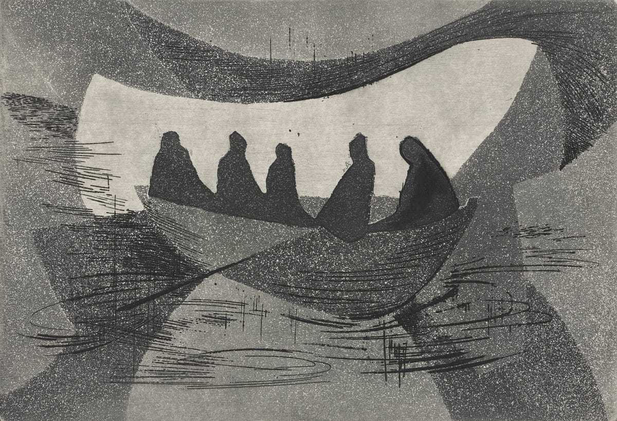 In the most recognizable of his works showing at Myth & Legend—the Art Gallery of Ontario’s current Blackwood retrospective—the Great Lost Party Adrift prints of 1965 and 1971, vast groups of tiny men swarm ant-like atop a monumental iceberg, consumed by the fierce landscape. These prints sit at the heart of the 1973 book Wake of the Great Sealers, Blackwood’s collaboration with writer Farley Mowat, which depicted the wind and salt-whipped life of the sealers of Bragg’s Island, through the lens of the sealing disasters of 1914. The horrors of those men on the ice that year remain one of Newfoundland’s founding myths, invoking not just the ocean and its terrors, but the betrayals of those who worked it by those in power. There are too many figures to count atop that berg, but their collective fate is clear and horrifying. Nothing to do but face it down stoically. In the case of the much smaller five silhouettes adrift in their boat in Survivors (1961), even escape from the horror doesn’t come with relief so much as a recognition of the horror they will bear for the rest of their lives.
