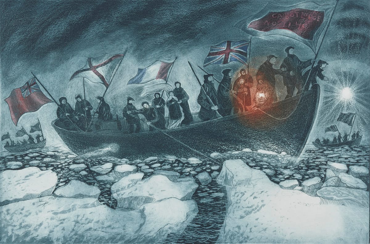 This is laid out through the evolution of Wedding on Deer Island (2020), one of the more ambitious prints of his final years and produced, as all of his work was by then, in collaboration with Janita Wiersma. Though the characters in the initial graphite outlines seem rudimentary, almost nothing changes about them as the work begins to layer and shift through etching and aquatint. The ideas are already firmly in place, but new meaning emerges through the evolution of the image around them. Despite the boat pushing through dense pack ice, this is not another horror—it’s a gathering of men, women, and children sailing under a hodgepodge of flags, on their way to a celebration. In the final iterations, Blackwood allows something striking—the warmth of a lantern at the boat’s prow, glowing red, breaking through the gloom. This was not a journey of suffering but a boat, unlike most of his others, that these people are simply glad to be on.